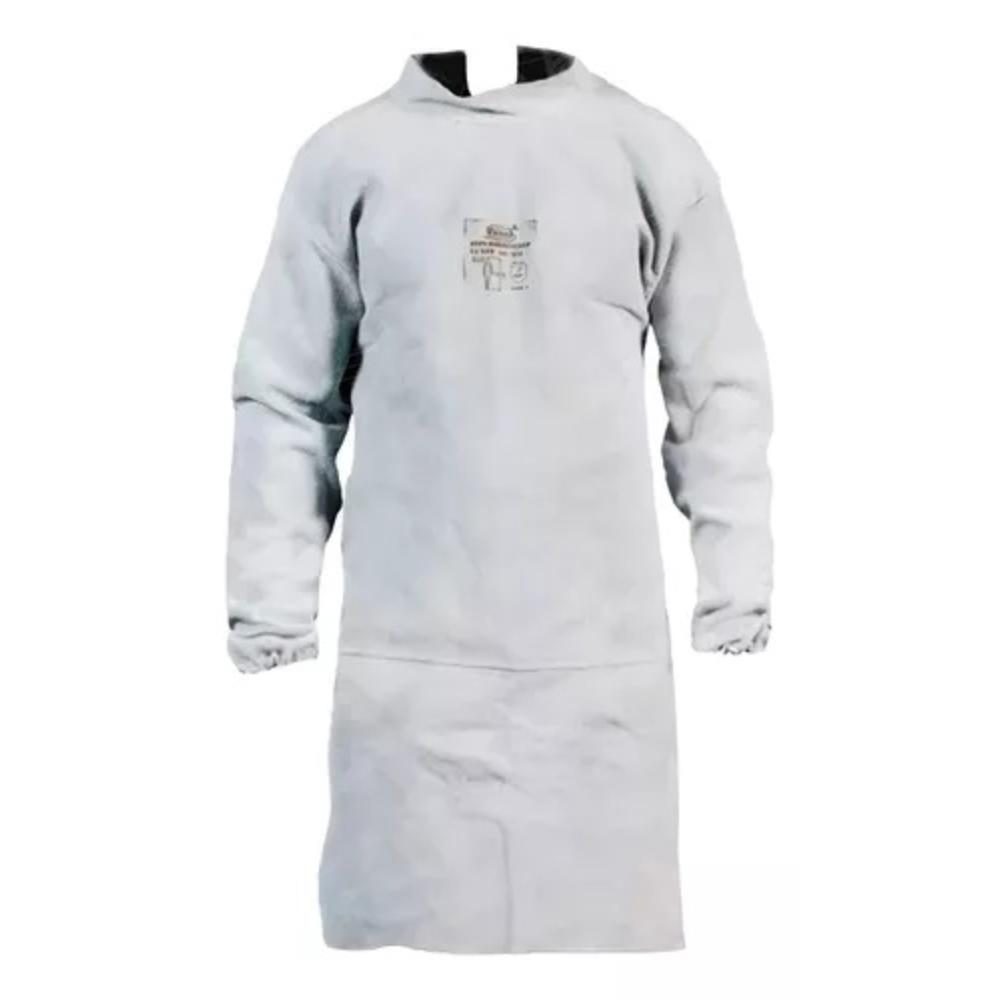 Avental de segurança em raspa natural, com mangas, gola e ombros no mesmo material, elásticos nas costas e punhos para ajuste, costurado com linha de algodão e nylon. Indicado para proteção do corpo contra agentes abrasivos, escoriantes e térmicos em operações de soldagem e processos similares.