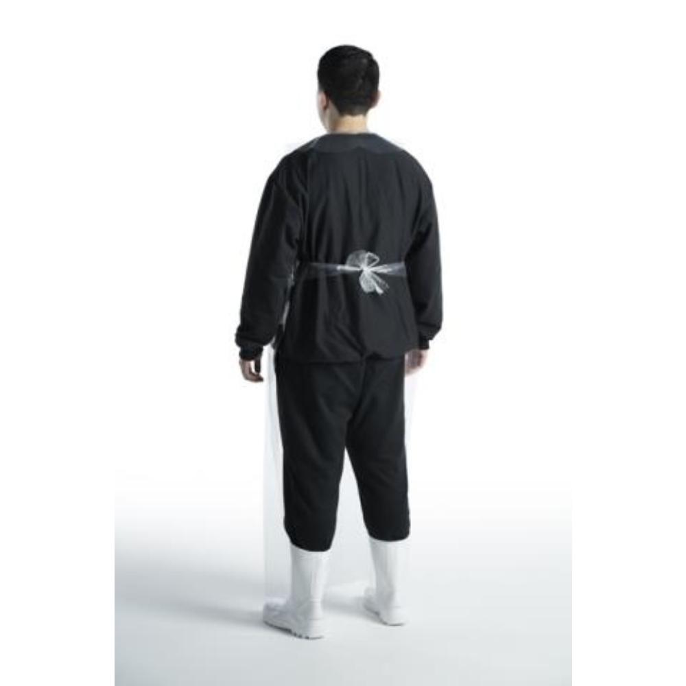 Avental de segurança confeccionado em filme de polietileno transparente, fabricado em peça única, tiras laterais no abdômen para ajustes, sem componentes metálicos.