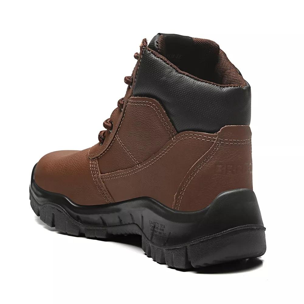 Confeccionada em couro estampa relax na cor marrom, a botina possui colarinho acolchoado e língua semi fole, proporcionando melhor ajuste e evitando a entrada de resíduos. O interior conta com forração em tecido no cano e material não tecido na gáspea, ambos com excelente capacidade de absorção de suor, potencializado pela tecnologia Airtech, que promove rápida evaporação da umidade.