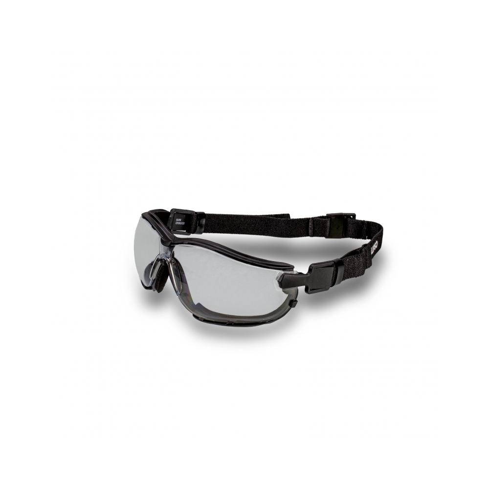 Óculos de proteção, modelo ampla-visão constituídos de armação confeccionada em uma única peça de plástico rígido com sistema de ventilação indireta composto por 7 fendas localizadas na parte superior e 6 fendas na parte inferior das bordas da armação, visor confeccionado em policarbonato encaixado à armação nas laterais e na parte central através de pinos de apoio, espuma de poliuretano na parte interna da armação e suporte nasal, semi-haste, tipo presilha plástica fixada nas extremidades laterais do visor de modo a permitir a colocação de tirante de elástico que se ajusta à face do usuário através de regulagem de tamanho, onde este tirante possui uma presilha para fechamento. O modelo cobre toda a região em torno dos olhos do usuário.